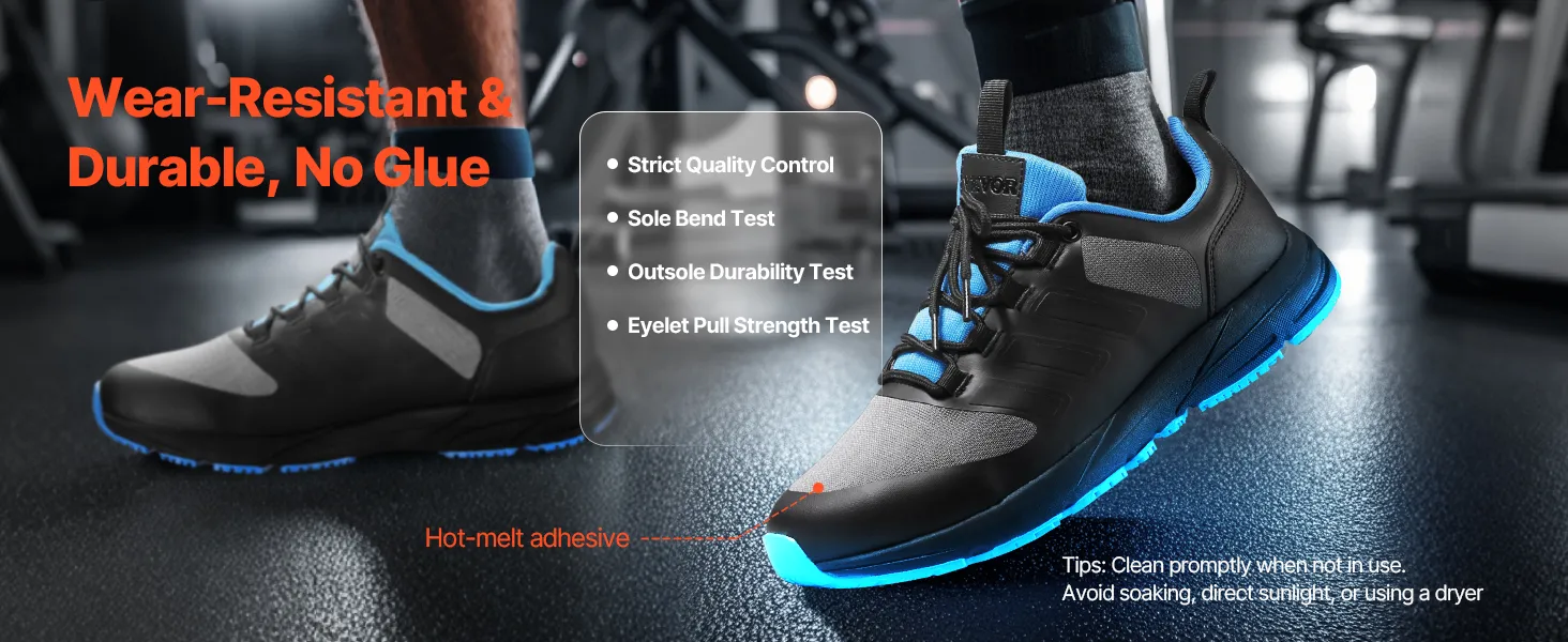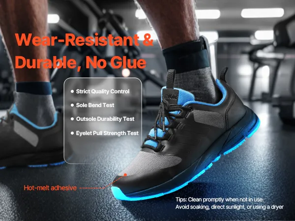 Värmepressad tåförstärkning och en sula som testats för flexibilitet, slitstyrka och öljettstyrka. Byggd för hållbarhet, vilket garanterar skydd mot slitage och lossning vid längre tids användning.