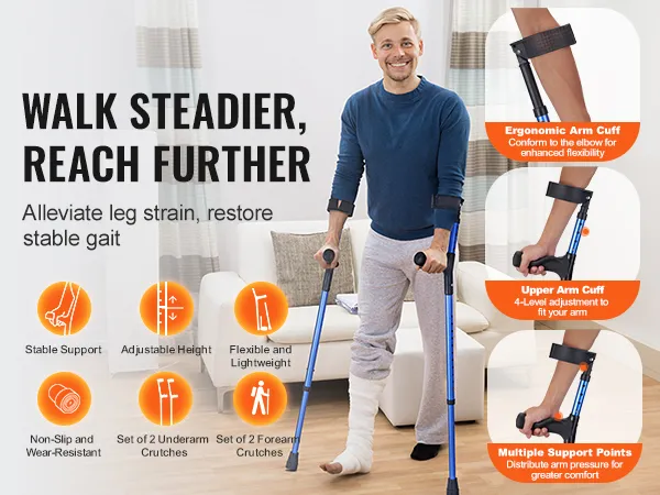 Πατερίτσες αντιβραχίου VEVOR για ενήλικες, Πατερίτσες βάδισης ρυθμιζόμενου ύψους 11 επιπέδων με άνω μανσέτα 4 επιπέδων, ελαφριές πατερίτσες ιατρικής υποστήριξης αλουμινίου για τραυματισμούς στο πόδι, χειρουργικές επεμβάσεις για άτομα με αναπηρία, 1 ζευγάρι (350 λίβρες)