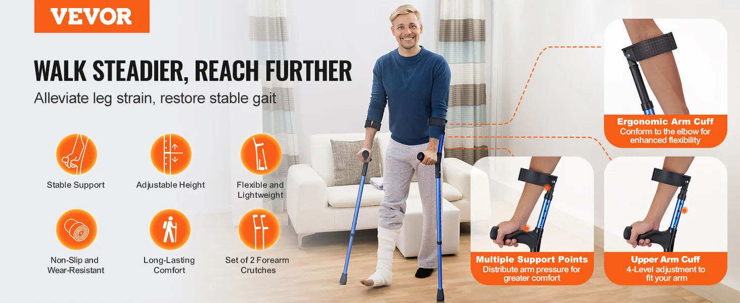 Αξιόπιστος συνεργάτης για το περπάτημα: Οι πατερίτσες βάδισης VEVOR, κατασκευασμένες από ανθεκτικό κράμα αλουμινίου, υποστηρίζουν έως και 137 κιλά, εξασφαλίζοντας σταθερότητα και ασφάλεια. Ιδανικές για τραυματισμούς στα πόδια, ηλικιωμένους, άτομα με αναπηρία ή μετεγχειρητικά άτομα, ανακουφίζοντας από την καταπόνηση των ποδιών και αποκαθιστώντας το σταθερό βάδισμα.