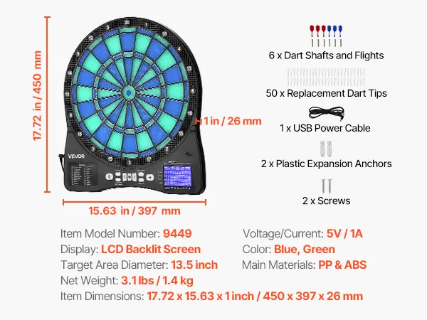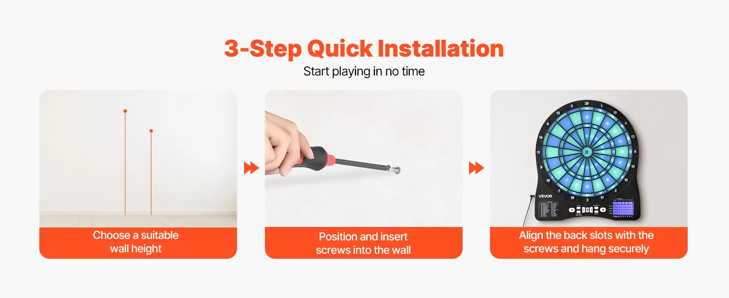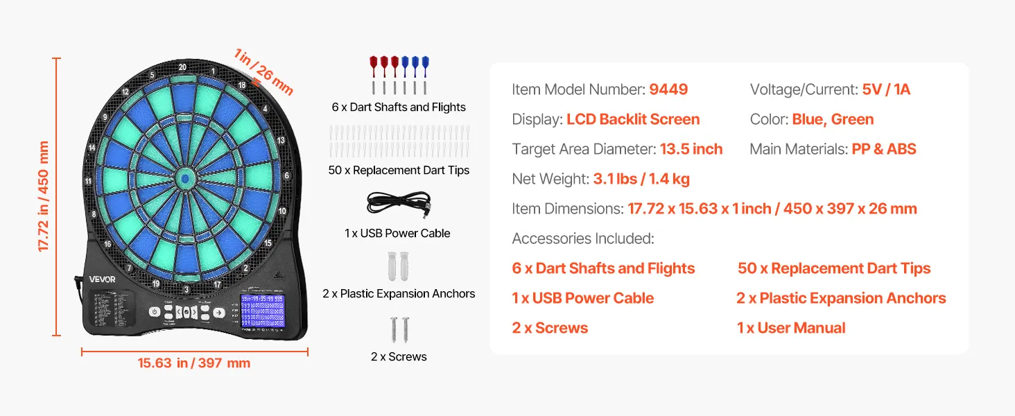 Easy Use & Setup: Includes 6 dart shafts and flights, 50 replacement dart tips, 1 USB power cable, 2 plastic expansion anchors, 2 screws, and a user manual. No complicated setup—just mount and play, making it perfect for both beginners and enthusiasts