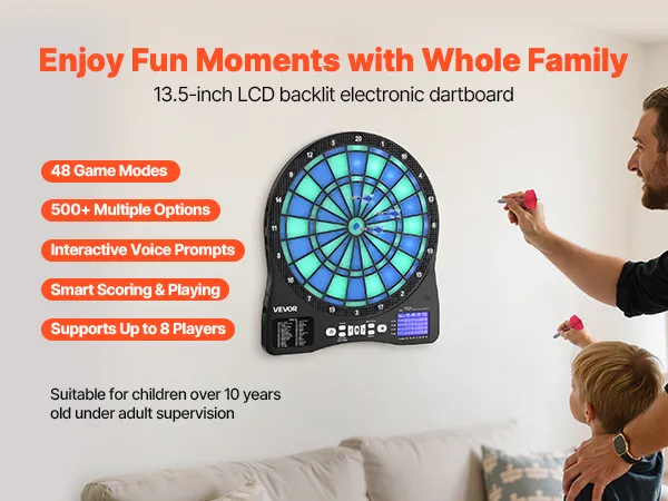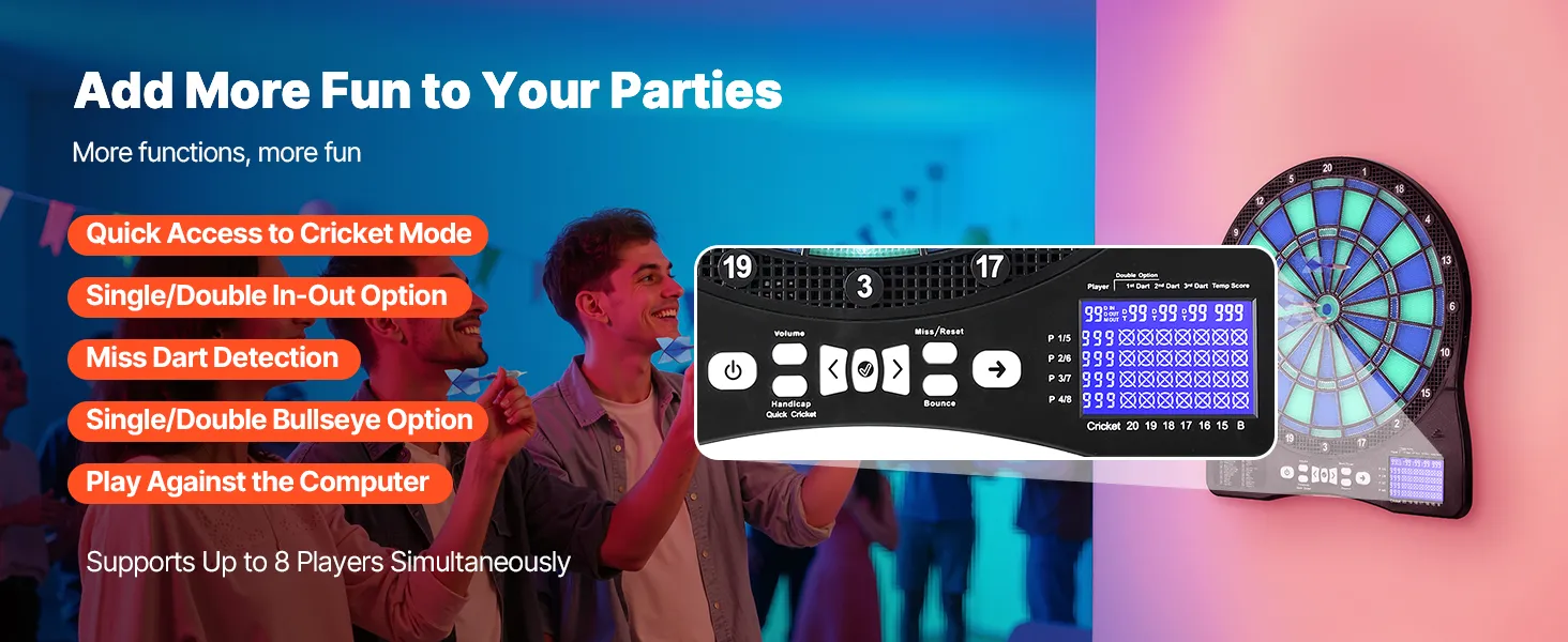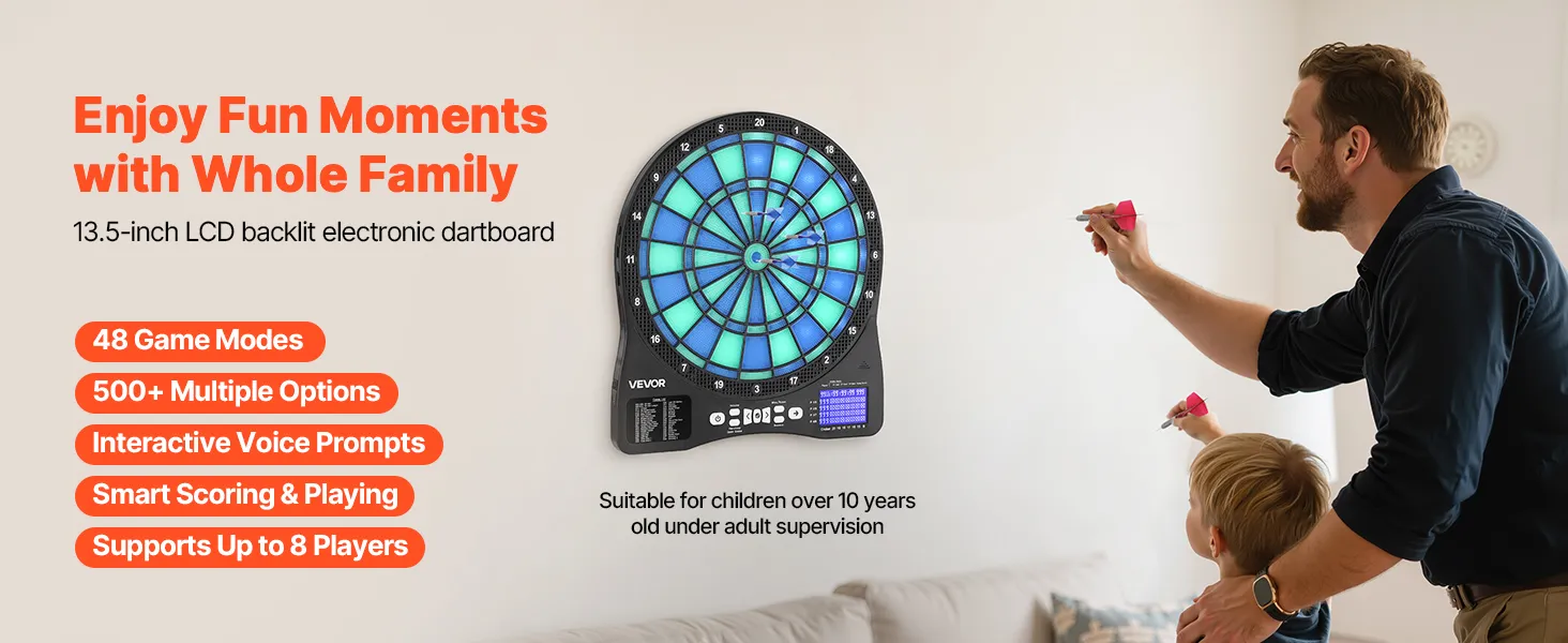 This electronic dartboard comes with 48 game modes and 500+ gameplay combinations, supporting up to 8 players. With an LED-backlit target surface and an LCD scoring screen that displays real-time scores and round progress for precise hits, ideal for family gatherings, office fun, or holiday parties.