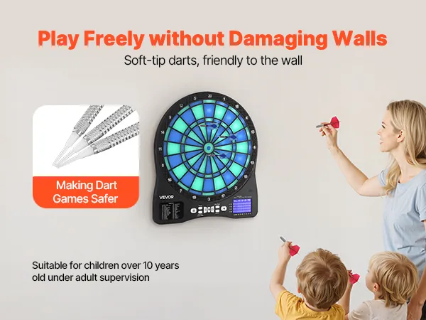 The electronic dart board includes soft dart tips that minimize scratches and impacts, protecting your walls from damages. It delivers a fun-filled and interactive gaming experience at home, parties, or in game rooms.