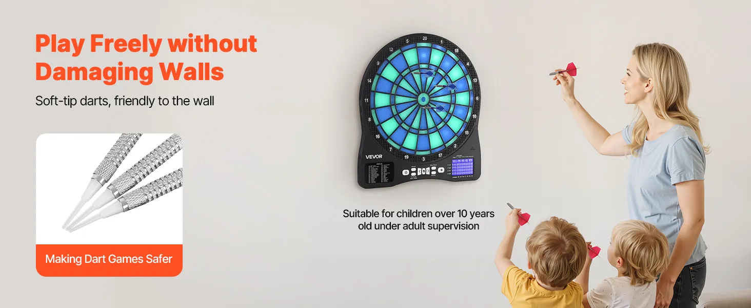 Reduced Bounce-Outs: Our electronic dart board features a honeycomb target design with finely partitioned edges to improve hit rate and minimize bounce-outs. Combined with the included soft dart tips, it allows for safe, free play without damaging your walls