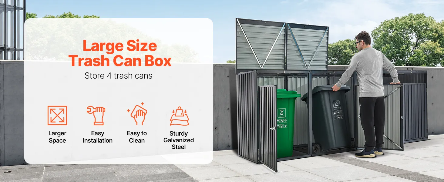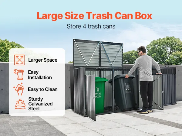 Effektiv utomhusförvaring: Denna papperskorgslåda i metall har ett uppgraderat, större fack som effektivt döljer och organiserar papperskorgar för att bibehålla ett snyggt och estetiskt tilltalande utrymme. Den är utformad för att diskret förvara upp till fyra papperskorgar i din trädgård, gård eller gräsmatta.