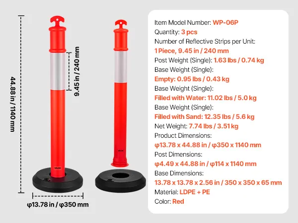 VEVOR 3 Pack Traffic Delineator Posts, 1140 mm Traffic Safety Cones with Fillable Base and Reflective Strips, Heavy Duty Delineator Posts for Construction Site, Parking Lot, Crowd Control, Red