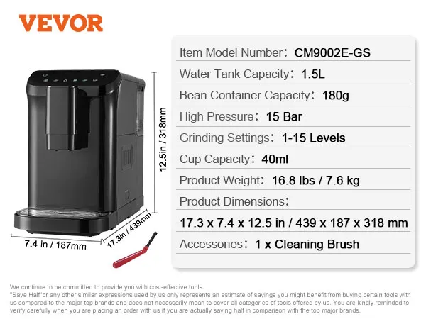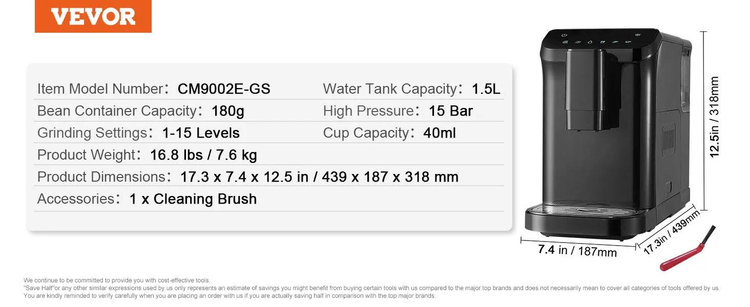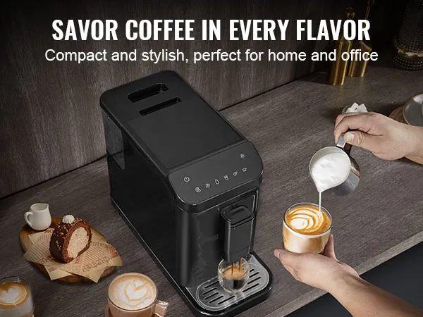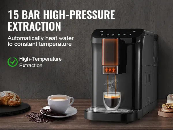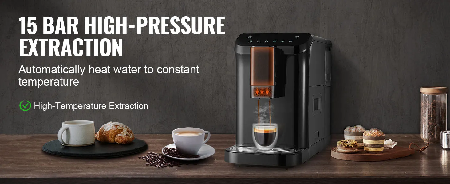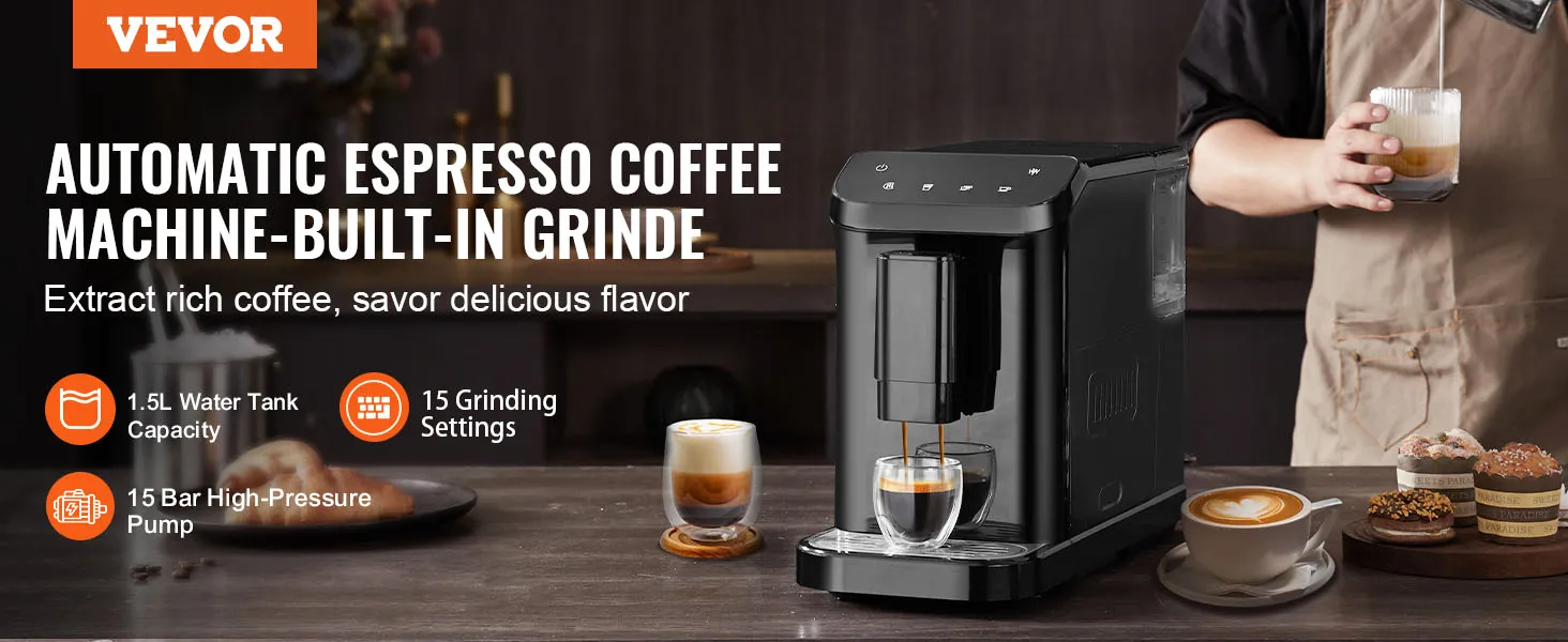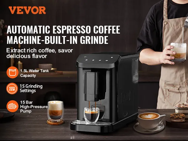 VEVOR automatic espresso machine combines convenience and performance to deliver the perfect cup of coffee. Featuring a built-in grinder with 15 adjustable settings, and 15-bar high-pressure extraction, it effortlessly transforms your favorite beans into a rich, aromatic espresso.