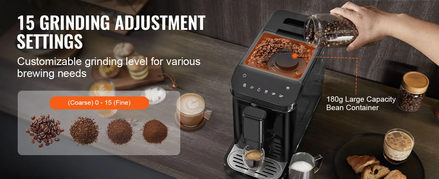 Built-in Grinder & Adjustable Grinding: VEVOR automatic espresso machine features a built-in grinder and a spacious 180g bean hopper, allowing you to transform your beans into espresso in just seconds. With 15 grinding settings to choose from, customizing your coffee to match your taste preferences is effortless.