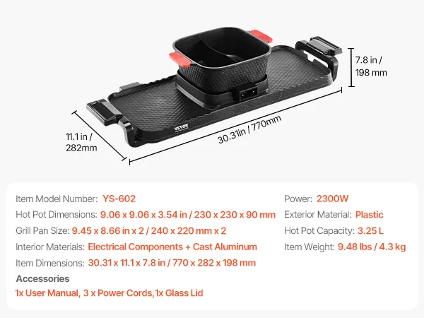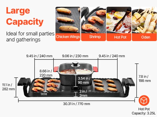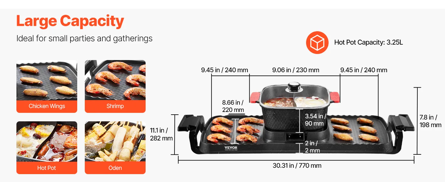 Large Capacity: Featuring a detachable 9.06 x 9.06 x 3.54 in (230 x 230 x 90 mm) hot pot and two 9.45 x 8.66 in ( 240 x 220 mm) grill pans, our 3.25 L hot pot and grill easily serve 1-6 people for a fun and filling gathering
