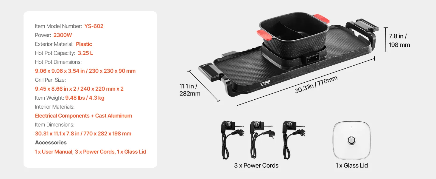 Hot Pot & Grill: 2300W high power for rapid heating. Enjoy quick and continuous heating with our versatile hot pot with grill. Ideal for hot pot, grilling, and more, catering to a variety of flavors. Time-saving and efficient
