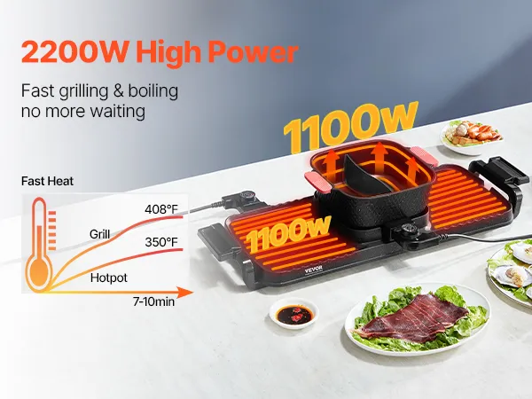 Gather your friends without the wait. With 2300W high power, our hot pot and grill heat up fast, letting you get your meal started in no time, whether you're grilling or boiling.