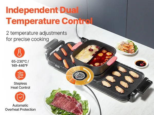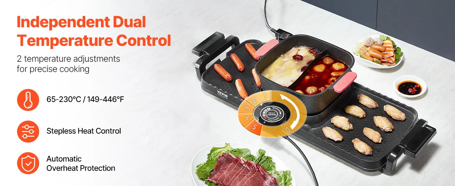 Our hotpot pot electric with grill delivers dual knob zones for separate and precise heat settings. It effortlessly manages low and high heat, ensuring no cross-interference and giving you complete control for delicious cooking results.