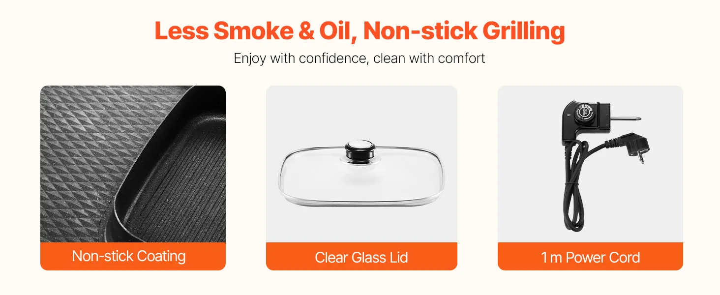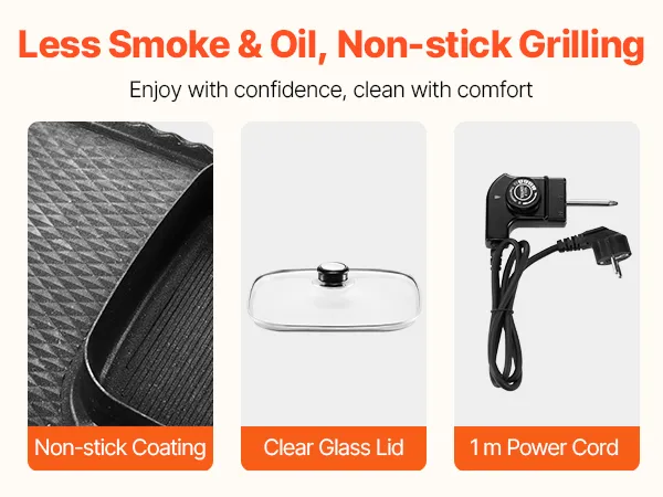 Non-stick & Easy to Clean: With a non-stick coating, our hotpot pot electric with grill minimizes smoke and oil. Meanwhile, the raised grooves reduce sticking. Enjoy easy food flipping and effortless cleaning