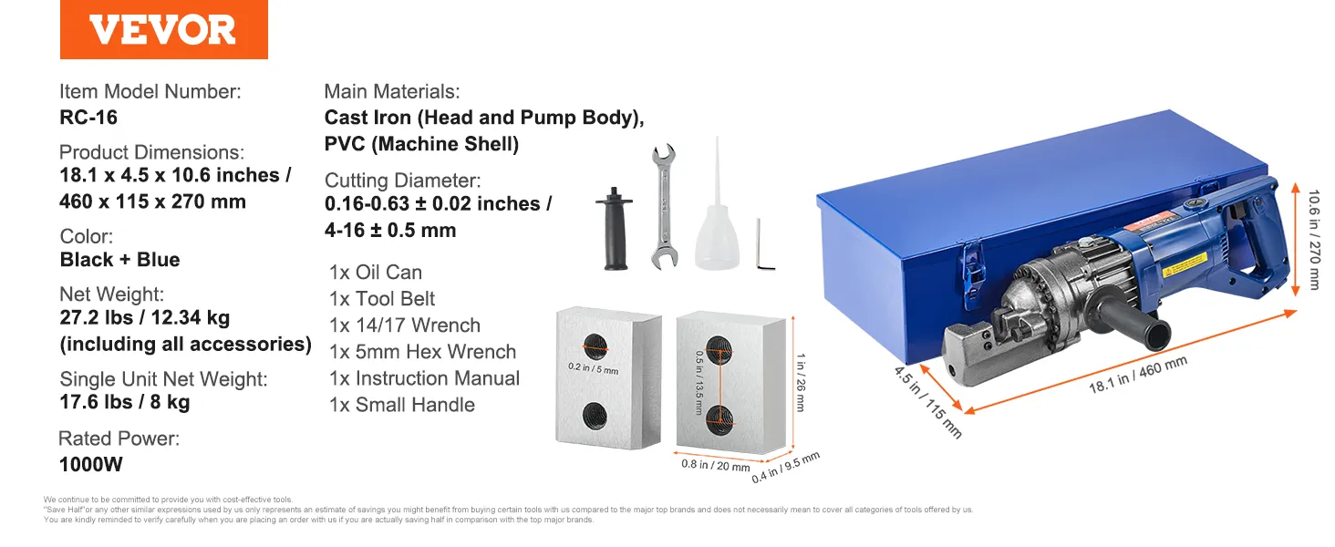 VEVOR Electric Hydraulic Rebar Cutter, 1000W Portable Rebar Cutter, Cutting up to 5/8 Inch (4-16mm) #5 Rebar within 2 Seconds, High Power Steel Rebar Cutter w/ Tool Case Oil Can,Black Blue RC-16