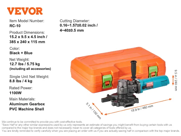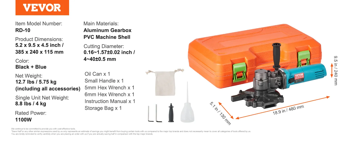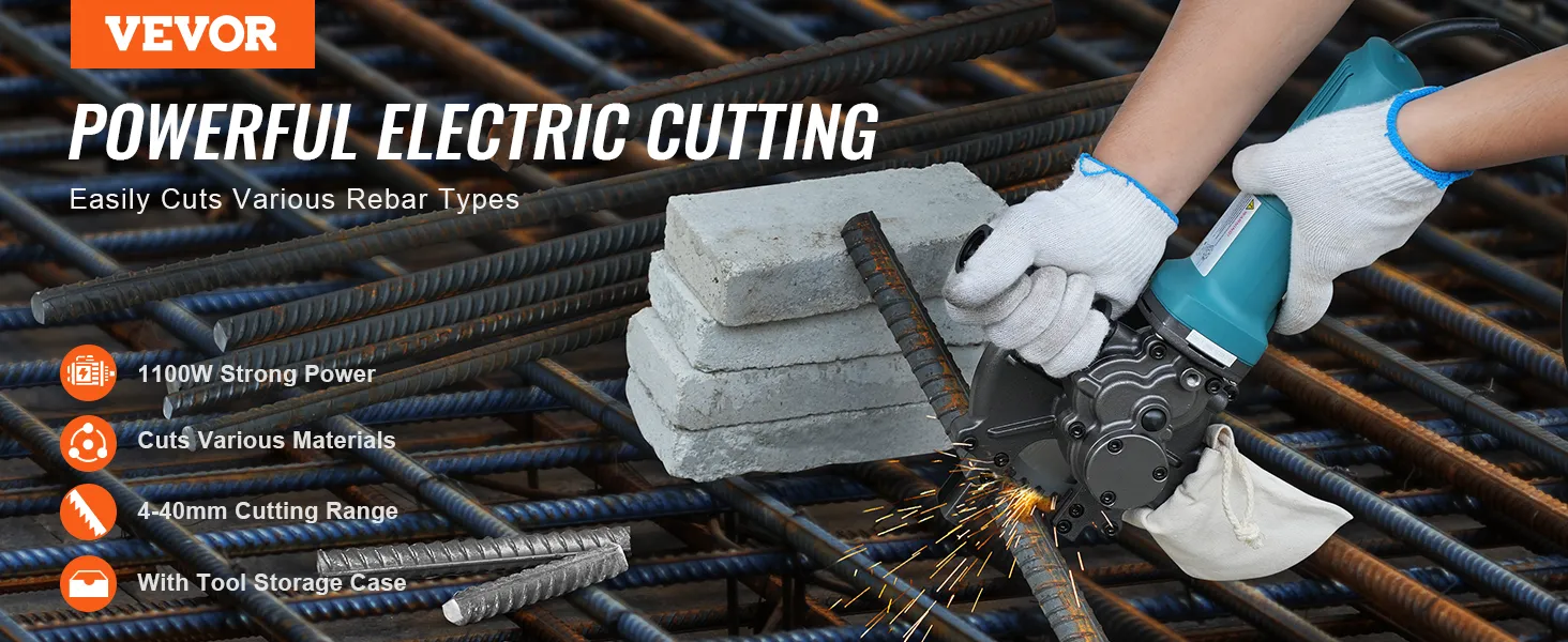 VEVOR Electric Rebar Cutter, 1100W Portable Rebar Cutter, Cutting up to 3/2 inch (4-40mm) Rebar, High Power Steel Concrete Rebar Cutter with Auxiliary Small Handle Tool Case, RD-10