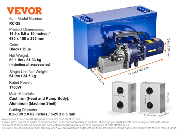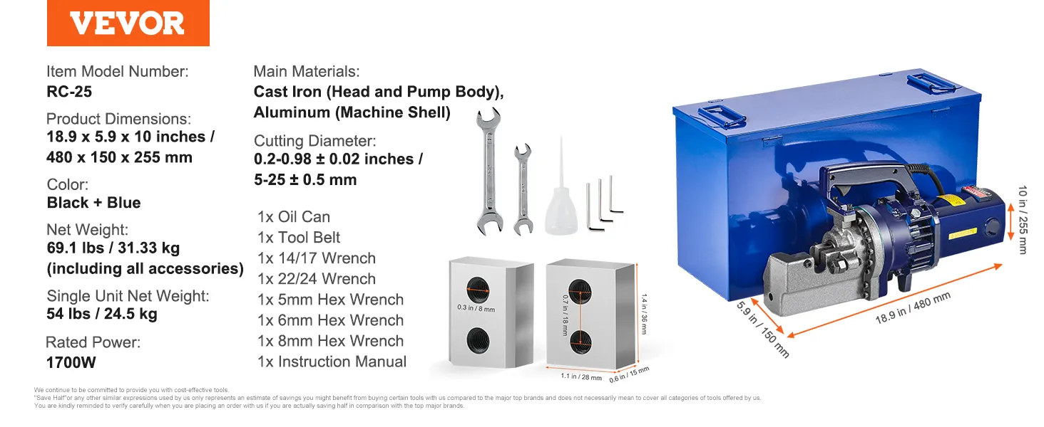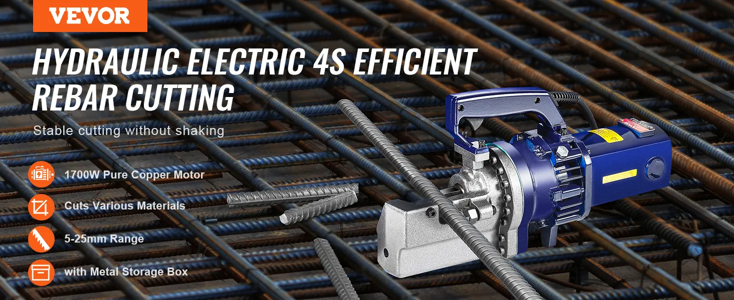 VEVOR Electric Hydraulic Rebar Cutter, 1700W Portable Rebar Cutter, Cutting up to 1 Inch #8 (5-25mm) Rebar within 4 Seconds, High Power Steel Rebar Cutter w/ Tool Case Oil Can,Black Blue RC-25