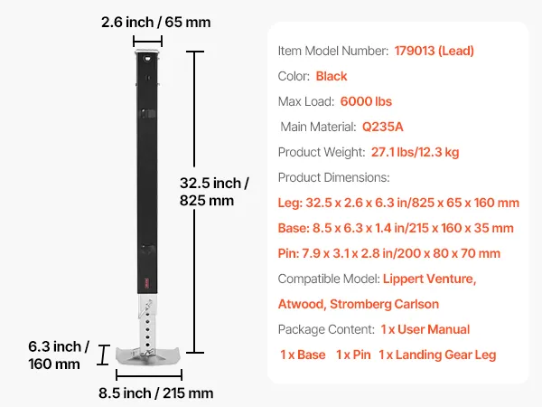 VEVOR RV Lead Fifth Wheel Landing Gear Leg 179013, 825 mm 5th Wheel Landing Gear Universal Replacement Compatible with Lippert Venture, Atwood, Stromberg Carlson Systems, with Pin and Base, Black