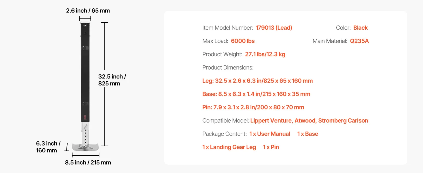 OEM-Style Design: Built to OEM specifications, this 5th wheel landing leg replicates the original (#LG-179013) with matching height and bolt pattern. No grinding or drilling needed—just a direct bolt-on replacement for a stable, shake-free setup