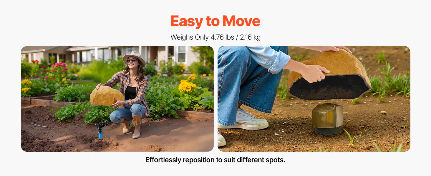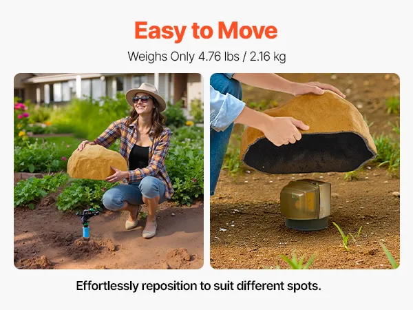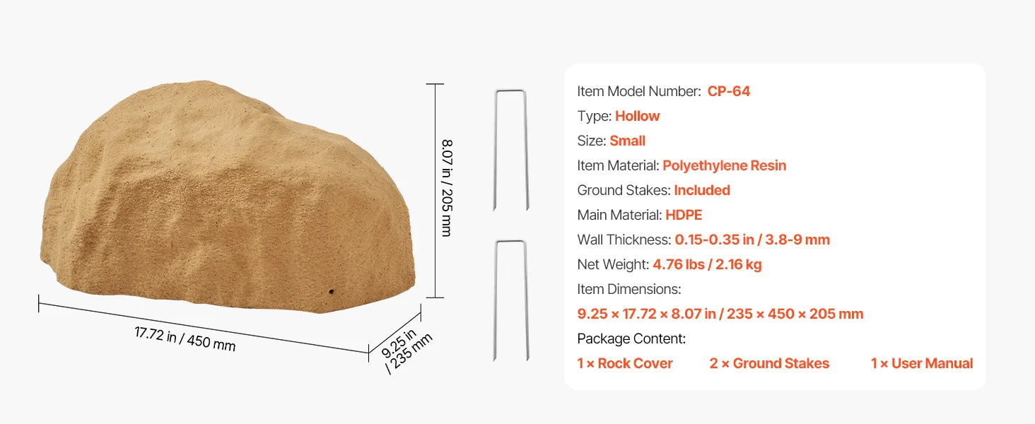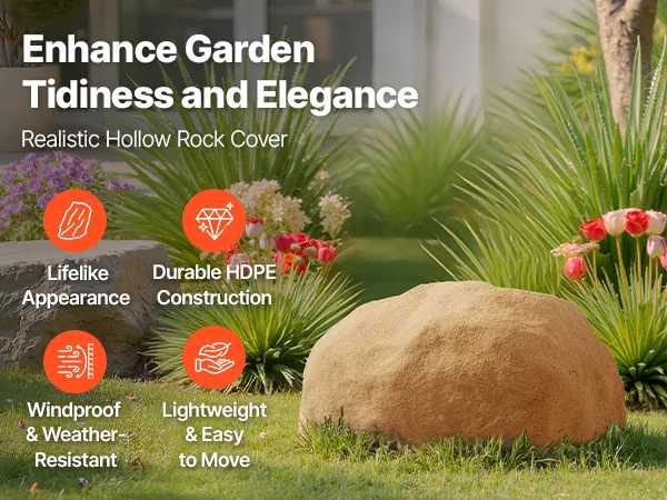Lightweight for Easy Moving: Our landscape rock cover only weighs 4.76 lbs with a sturdy & lightweight hollow structure. It is easy to carry and place by one person. The rock-like design can be rotated to adjust the angle, adapting to different scenes