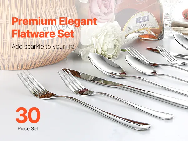 30dílná sada příborů: Tato sada příborů obsahuje 6 jídelních vidliček, 6 jídelních lžic, 6 jídelních nožů, 6 dezertních vidliček a 6 dezertních lžic, což z ní činí nezbytný předmět pro použití doma i v restauraci. Ať už se jedná o každodenní jídla, přípravu večeře nebo večírky, tato sada příborů je nepostradatelným stolním nástrojem.