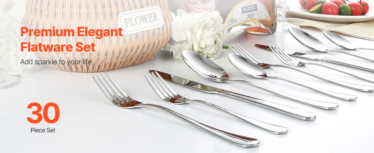 Sada příborů VEVOR 30 kusů, příbory z nerezové oceli potravinářské kvality, sada příborů se zrcadlovým povrchem, nádobí vhodné do myčky nádobí pro kuchyň a domácnost, servírování pro 6 osob, včetně nože, vidličky, lžíce
