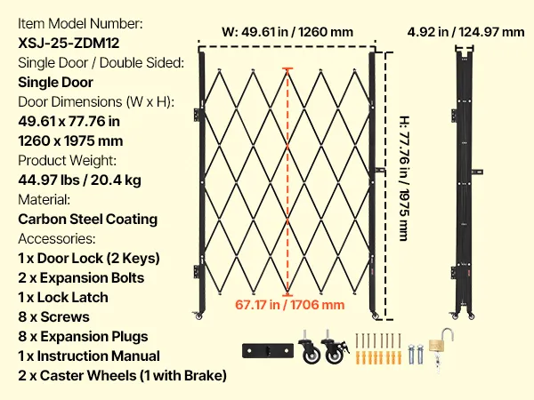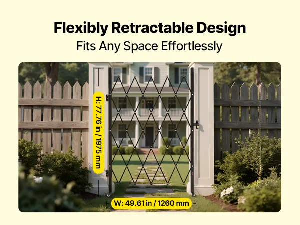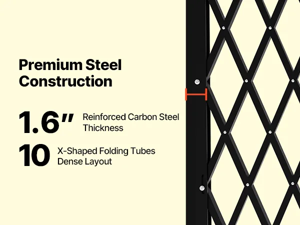 Retractable Folding Gate: The folding gate uses a retractable width structure. Maximum unfolded size: 49.61 x 77.76 in (W x H). Minimum folded width: 4.92 in. This standard size fits security doors, protective barricade gates, and defense facilities.