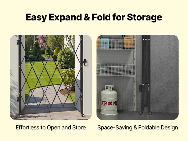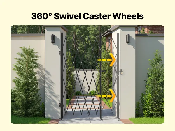 Flexible Rolling Casters: Our scissor gate has 360° swivel casters with locks at the bottom to fix positions. The side-folding door stays unobstructed when open or fully closed. Smooth-rolling enables easy transport and storage.