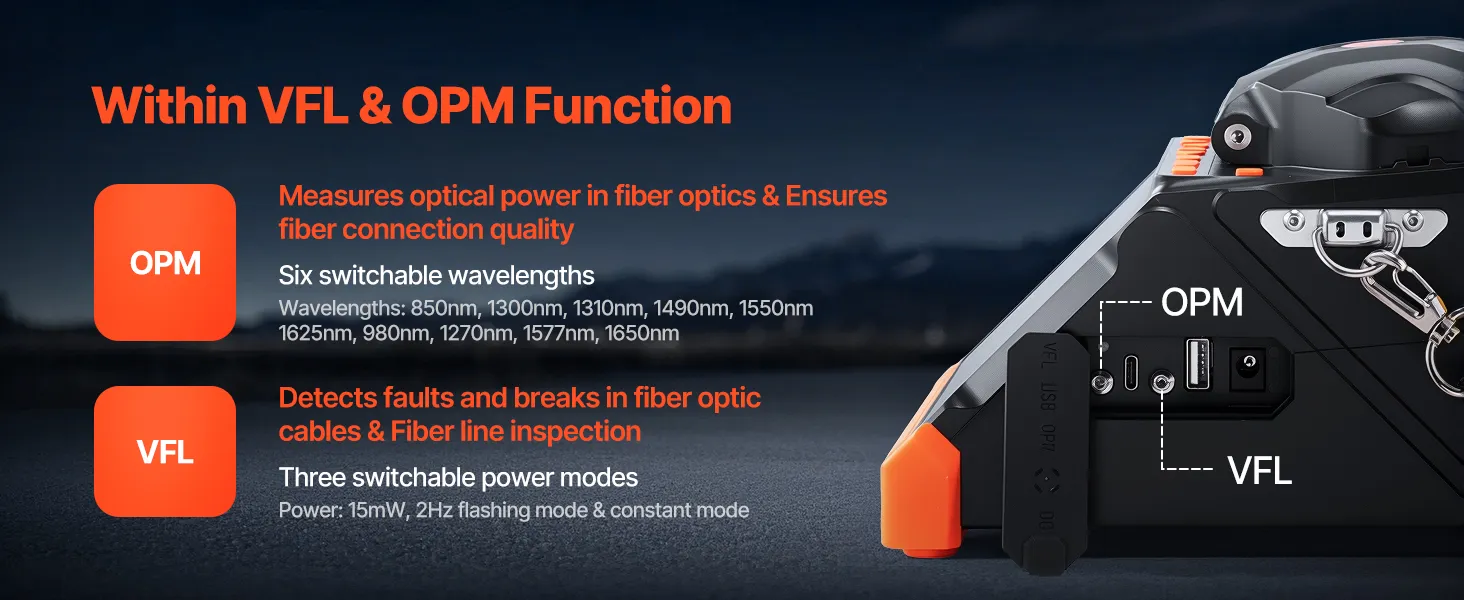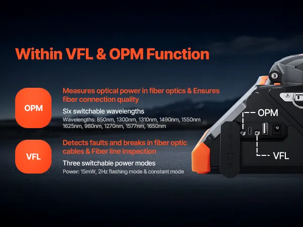 Vår optiske fusjonsskjøter er utstyrt med VFL (Visual Fault Locator) for rask deteksjon av fiberfeil, brudd og fiberlinjeinspeksjoner. OPM (Optical Power Meter) måler presist optiske effektnivåer og sikrer stabil tilkoblingskvalitet.