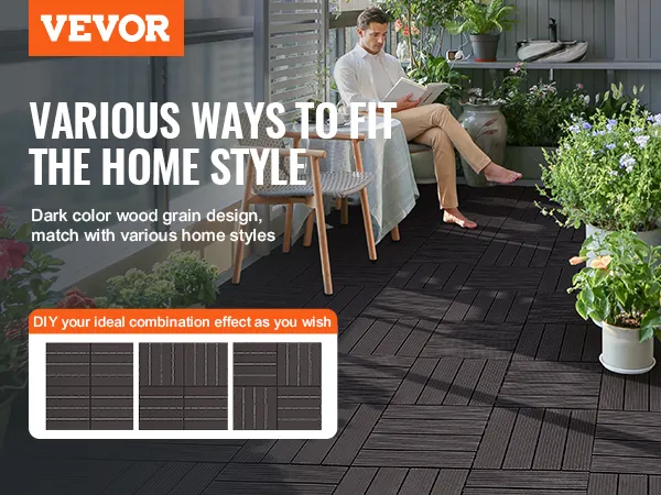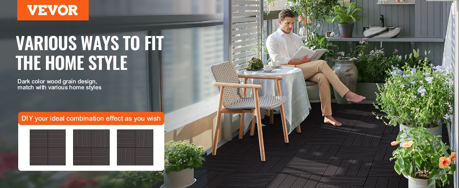 VEVOR Zámkové terasové dlaždice, balení po 10 kusech, 12"x12", 10 čtverečních stop plastová vodotěsná venkovní podlaha, použití za každého počasí, dlažba na terasu, krycí dlaždice na verandu, u bazénu, balkon, dvůr, tmavě hnědá
