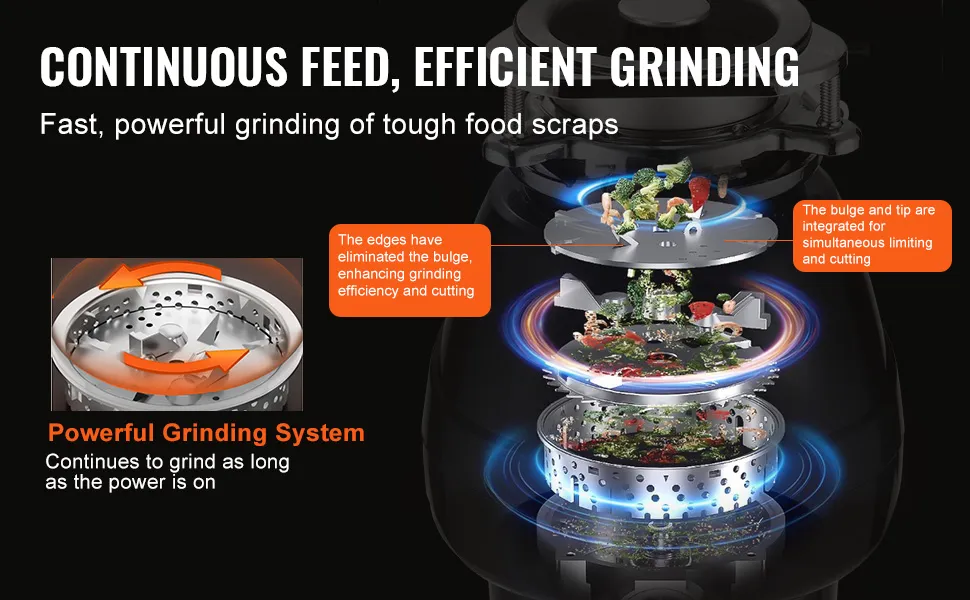 Designed for continuous feeding, this sink disposal effortlessly handles large amounts of daily food waste. Upgraded blades increase cutting power and precise limits, reducing clogging risk.