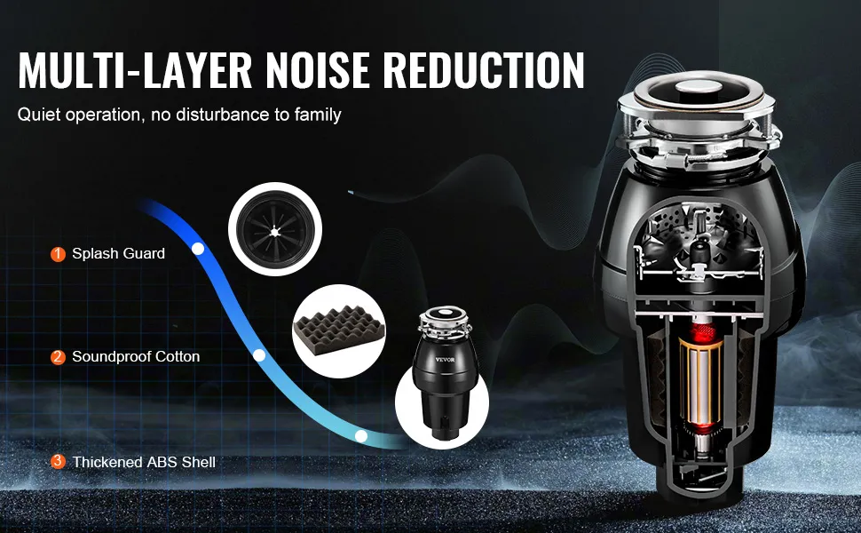 Multi-Layer Noise Reduction: Enjoy a quieter grinding experience with this kitchen sink disposal, featuring 3 layers of noise reduction—soundproof cotton, splash guard, and a thick ABS shell—to minimize disturbance and ensure peaceful operation.