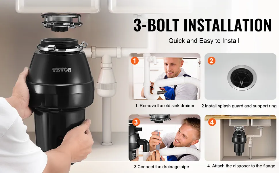 Simple 3-Bolt Installation: This garbage disposer offers easy, secure 3-bolt mounting with no special tools needed, ensuring a leak-proof connection and saving time on setup.