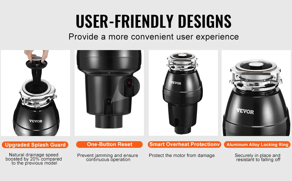 Experience enhanced convenience with thoughtful features. The manual reset button prevents jamming; smart overheat protection safeguard the motor from damage; upgraded splash guard effectively reduces splashing, keeping your kitchen clean while efficiently handling food waste.