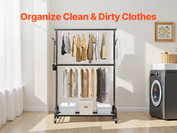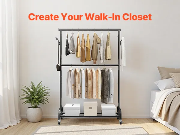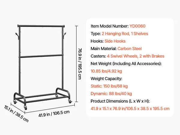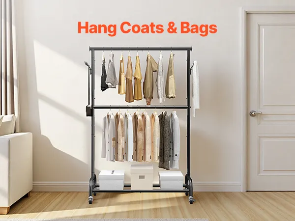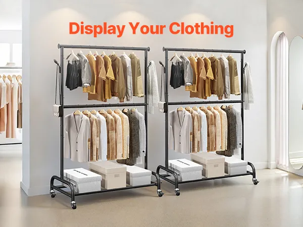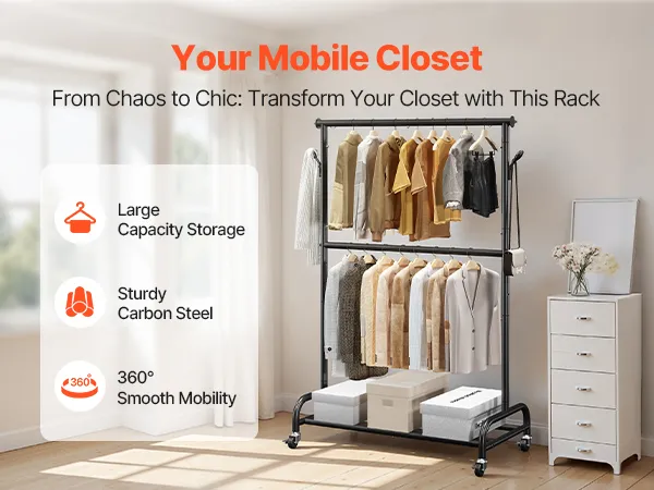 This clothes rack provides ample storage for clothes of all sizes. Built with heavy-duty carbon steel for stability, its 360° swivel wheels make moving and organizing your garments effortless.