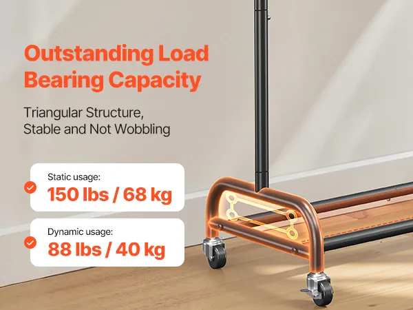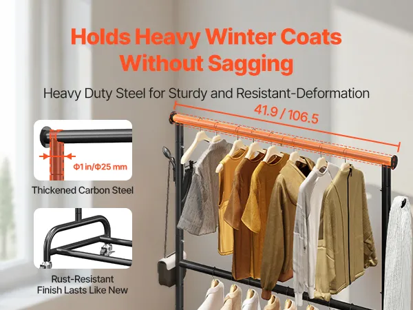 Stable Structure: The clothing garment rack is made of thick heavy-duty carbon steel, holding up to 150 lbs / 68 kg static and 88 lbs / 40 kg when moving, ideal for heavy garments. Rust-resistant coating protects against scratches and corrosion, keeping it durable and stylish