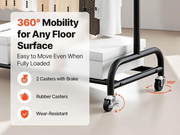 Flexible Mobility: The clothing rack comes with 4 smooth 360° swivel wheels, 2 with locks to keep it in place. Rubber casters roll quietly and protect floors from scratches, ensuring stability and safety while moving or standing still