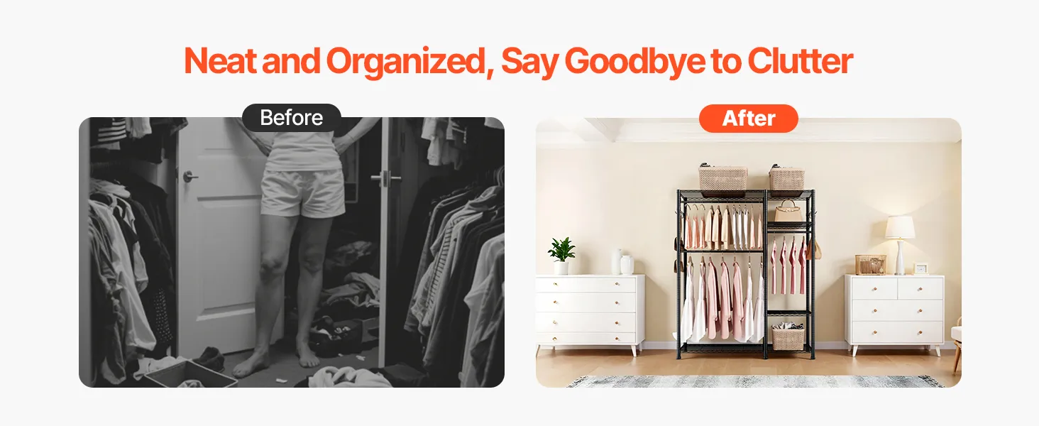 This clothes rack keeps clothes neatly arranged, maximizes indoor space, and makes it easy to find what you need. Ideal for daily wear or seasonal items, it helps maintain a tidy, attractive home while providing a comfortable and convenient storage experience.