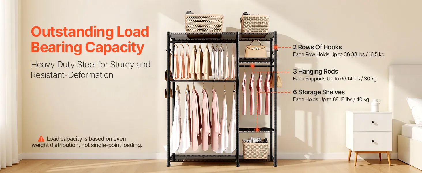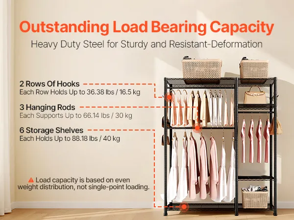 Sturdy Construction: Made of thickened carbon steel, this clothes rack supports up to 800 lbs / 363 kg, handling the weight of various clothing and accessories. The rust- and corrosion-resistant powder-coated finish protects against daily scratches and wear