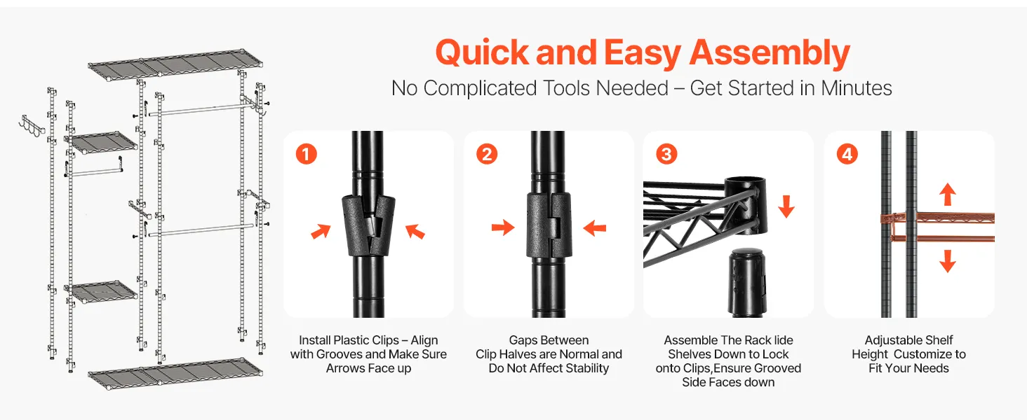 Easy Assembly: This hanging clothes rack features a slide-and-lock design for hassle-free installation. With simple steps, you can install plastic clips and storage shelves. For secure fit, we recommend tapping the shelves with a rubber mallet (not included)