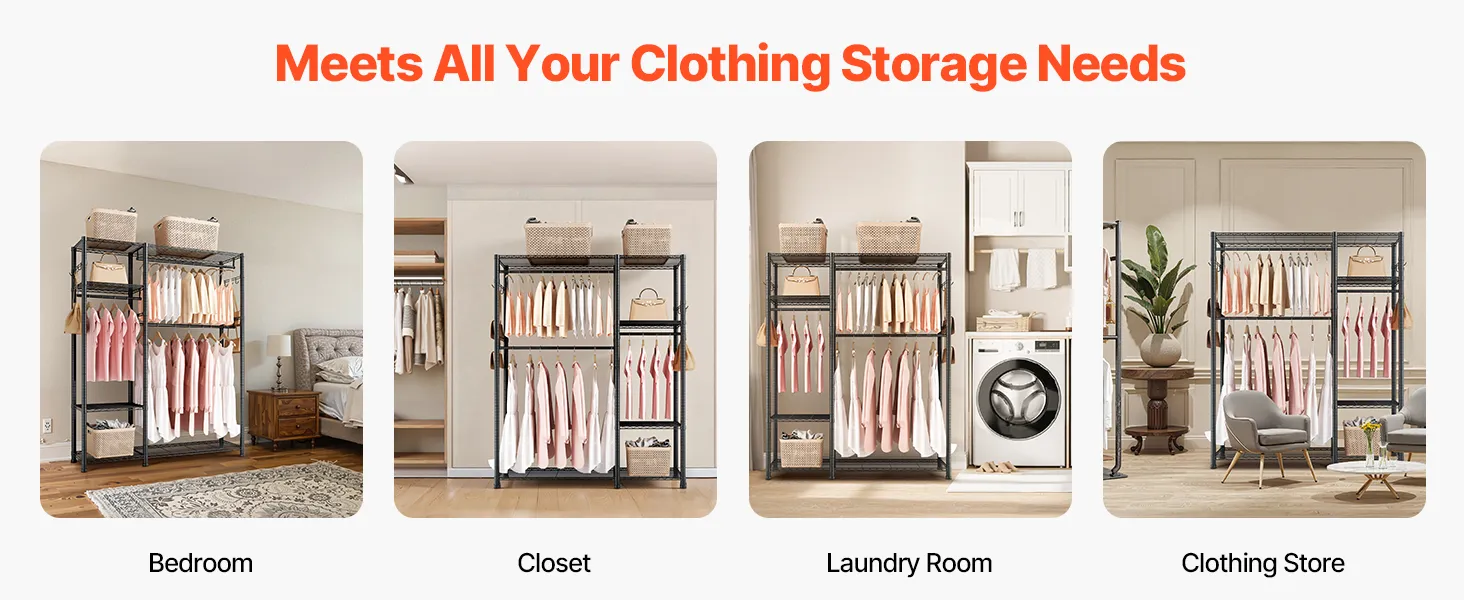 With a sleek and classic black finish, this heavy duty clothes rack fits effortlessly into any setting. Ideal for bedrooms, walk-in closets, laundry rooms, or retail stores, it adds elegance while meeting diverse storage needs.