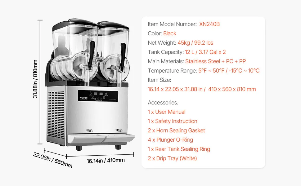 Denne kommersielle slushymaskinen har to tanker på 12 liter / 3,17 gallon, med et kabinett i rustfritt stål og PC-tank, laget av slitesterke og sunne materialer.