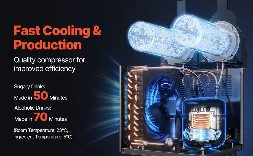Denne kommersielle slushie-maskinen er utstyrt med en høykvalitetskompressor og en kondensator i kobber, og kjøler raskt ned den, er energieffektiv, kjører stabilt og har lavt støynivå.