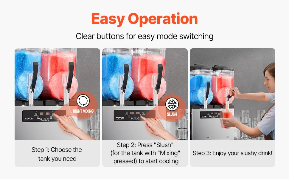 2 Tanques com Configurações Independentes: Com dois tanques de 12L / 3,17 GAL, esta máquina de granizado pode preparar aproximadamente 96 copos de bebidas granizadas por lote. Você pode optar por usar cada tanque separadamente. Requer reabastecimento menos frequente, tornando-a perfeita para uso comercial com alto tráfego. O tanque transparente exibe lindamente bebidas coloridas, tornando-a ideal para sorveterias, hamburguerias, cafés, bares e outros ambientes comerciais.