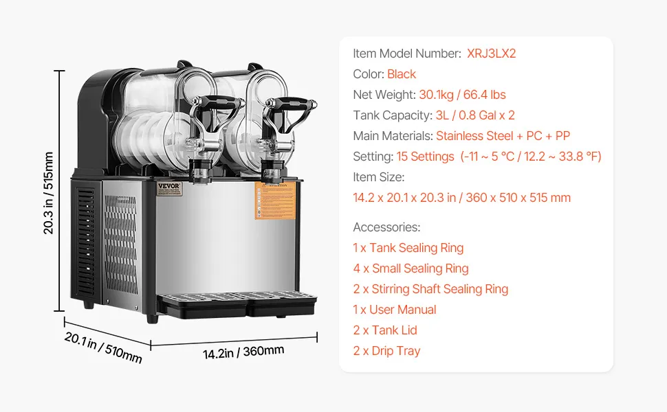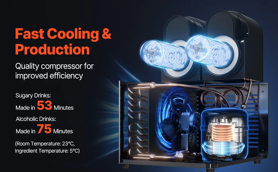 Dois Tanques de 3L: Esta mini máquina de granizado vem com dois tanques de 3L / 0,8 GAL de capacidade, capazes de produzir aproximadamente 24 copos de bebidas granizadas por lote (teor de açúcar recomendado: cerca de 13%, teor alcoólico: abaixo de 13%). O tanque transparente exibe suas bebidas coloridas com elegância, tornando-a perfeita para sorveterias, hamburguerias, cafés, bares e outros ambientes comerciais.
