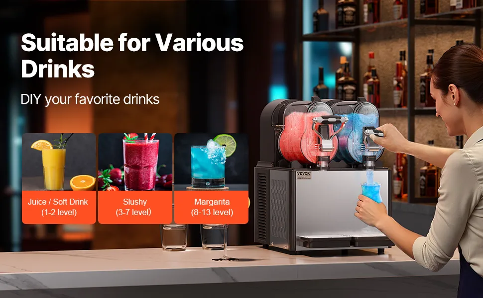 Para diversas bebidas: Esta máquina de granizado atualizada oferece 15 níveis ajustáveis (faixa de temperatura: -11 ~ 5 ℃ / 12,2 ~ 33,8 ℉), permitindo que você controle a temperatura para atingir a maciez ou dureza perfeitas para suas bebidas. Para sucos: 1-2 níveis; Para granizados: 3-7 níveis; Para margaritas: 8-13 níveis; níveis mais altos resultam em granizados mais firmes. É adequada para preparar uma variedade de bebidas, incluindo sucos, chás, margaritas e café gelado.