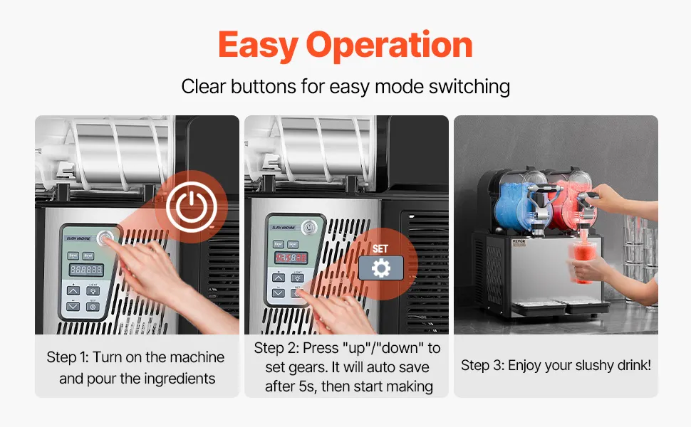 Durável e fácil de limpar: Feita com corpo de aço inoxidável e tanque de policarbonato de grau alimentício, esta máquina de raspadinha é feita para durar e é fácil de limpar. O tanque possui limpeza automática com um botão e os componentes modulares podem ser facilmente desmontados sem ferramentas para manutenção e limpeza sem complicações.