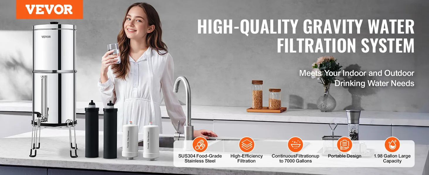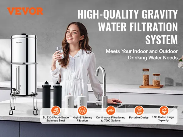 Systém filtrace vody VEVOR s gravitačním přívodem, stolní filtrační systém z nerezové oceli 304 2,25G, snižuje obsah olova a až 99 % chloru, se 2 filtry s aktivním uhlím, 2 defluoračními filtry, kohoutkem