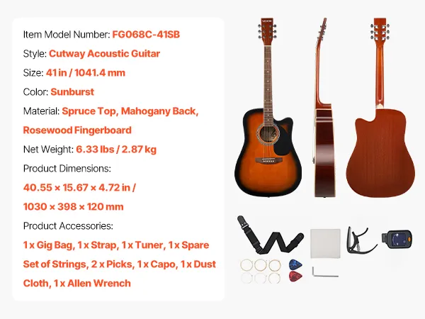 VEVOR 104.,4 mm (41 inch) Cutway Acoustic Guitar Beginner Bundle Gig Bag for Adult Sunburst VEVOR 104.,4 mm (41 inch) Cutway Acoustic Guitar Beginner Bundle Gig Bag for Adult Sunburst