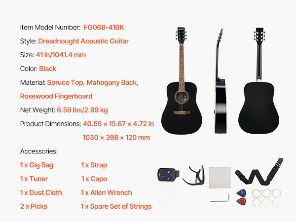VEVOR 41 in / 1041.4 mm Dreadnought Acoustic Guitar Beginner Bundle for Adult Taller Black VEVOR 41 in / 1041.4 mm Dreadnought Acoustic Guitar Beginner Bundle for Adult Taller Black