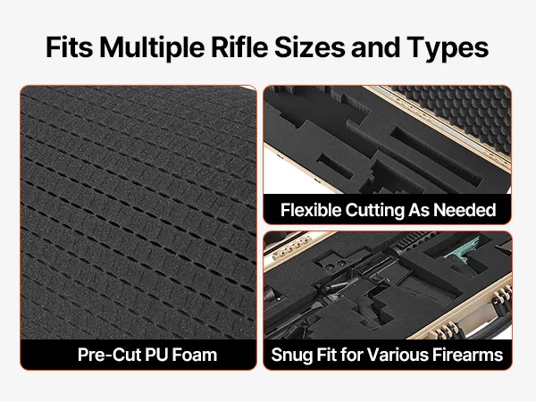 4-Layer Foam: Our gun case features 4 layers of soft foam:1 layer of egg-crate foam for shock absorption; 2 layers of pre-cut foam for a snug fit; 1 layer of solid foam for extra support. You can customize compartments tailored to the shapes of your rifle