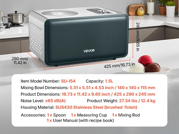 Large Capacity & Powerful Motor: Featuring a 1.5-quart capacity and a robust 150W motor, this compressor ice cream maker effortlessly produces enough ice cream for 1-3 people, ensuring quick and efficient performance every time